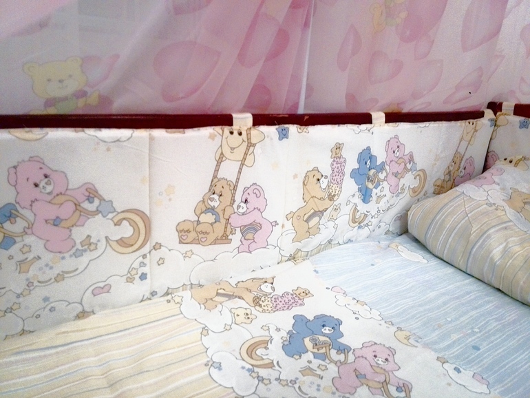 Бортики: из той же ткани, что и постель. Просто вырезала рисунок с мишками посередине) итого, ооочень много отходов и кусков (пошью из них наволочки), наполнитель поролон 1см