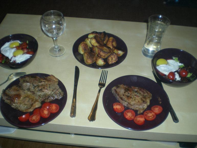 На ужин у нас были свиные стейки со специями и запеченный картофель, а еще приготовила наконец-то теплый салат из куриной печени - вкуснотища. А вот и фото нашего праздничного стола на скорую руку