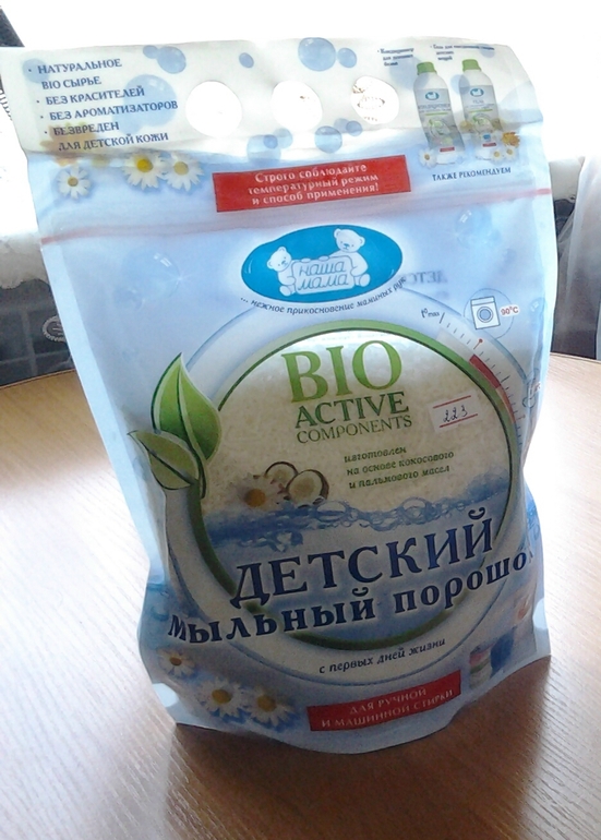 Очень хороший порошок им только и стирали до 6 мес наверно, тоже не знала что надо растворять в горячей воде, вроде итак нормально стирал.Сейчас у нас его не нашла взяла гель тоже НАША МАМА, прочитала состав вроде бы ничего, но не совсем понятно, даже подумала сняли с производства что ли.