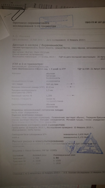 Я смотрю в эти бумажки, ничего не понимаю. Только бросается в глаза "синдром Дауна расчетный риск 1:27 ВЫСОКИЙ РИСК".....Какое у меня состояние после того, как я забрала эти бумажки......словами не описать.... Фото результатов и заключения УЗИ вкладываю, может кто-то знающий поможет разобраться.
