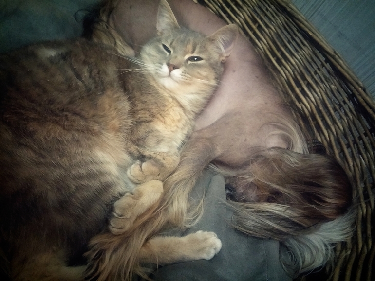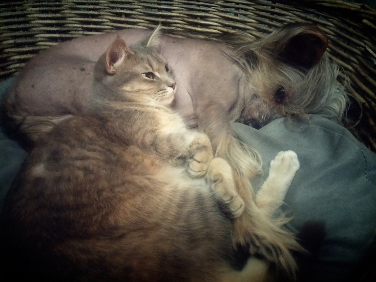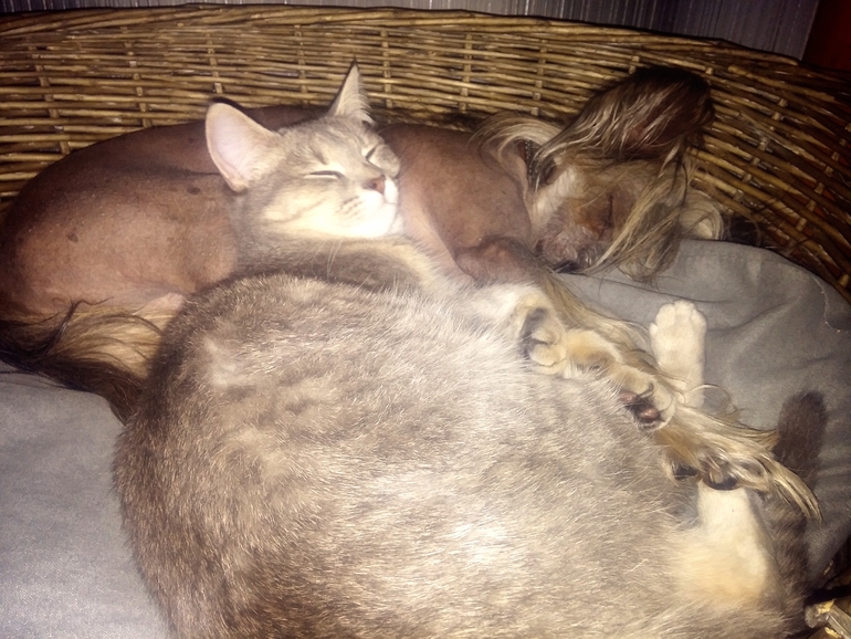 У меня кошка водохлеб и ей нужно писать раза три за ночь, а горшок в прихожей) а комнату мы закрываем) поэтому, приходится ей спать с собакой)