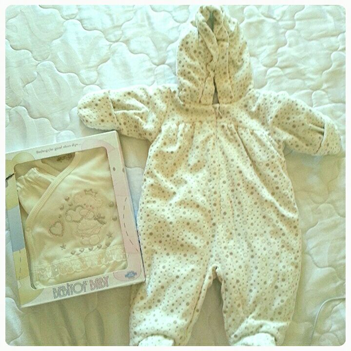 флисовый комбинезончик (фото цвет не передает, в реале кружочки эти - блестяшки) и комплектик: кофточка, ползуны, шапочка, царапки. все в цвете молоко. если совсем жара будет (что маловероятно) заменим комбинезон на легкий пледик.