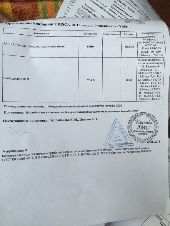 определение наличия в крови беременной женщины хорионического гонадотропина (β -ХГЧ)исследование белка плазмы А (PAPP-A)Норма свободной β-субъединицы гормона ХГЧ составляет в первом триместре либо 0,5–2 МоМ, либо (если измеряется в нг/мл) варьируется от 25,8 до 181.6 нг/мл в 10 недель и постепенно уменьшается к 14 неделе до 14,2 – 114,7 нг/мл.Когда проведен биохимический перинатальный скрининг 1 триместра, расшифровка полученных результатов β-ХГЧ происходит следующие образом. Если данный маркер выше нормы, у ребенка диагностируется повышенный риск синдрома Дауна. И, наоборот, если показатель ниже нормы, есть основания предполагать наличие синдрома Эдвардса.
