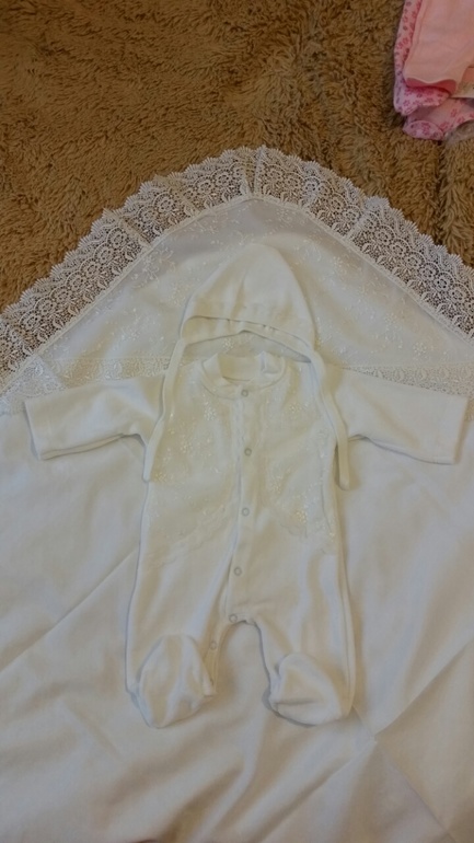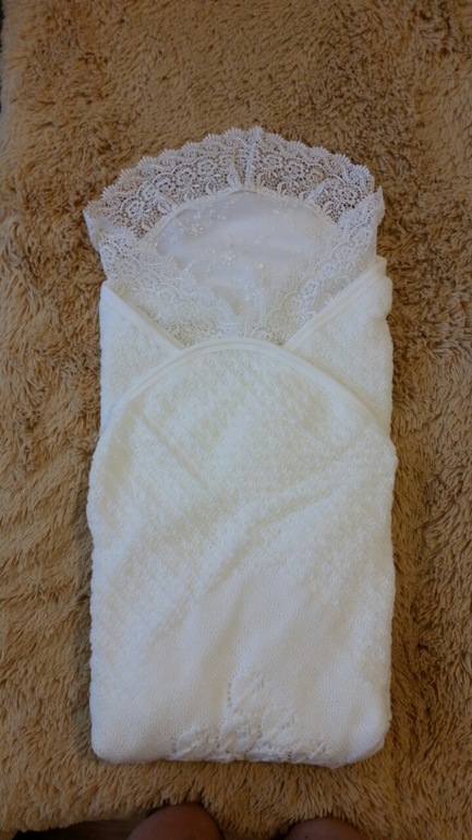 Наряд на выпискуКак я и хотела плед вязанный хлопковый, очень мягкий, внутри пелёночка с ажурным углом и велюровый слипик с шапочкой с такой же отделкой :) Думаю для нашей уральской погоды в самый раз! Ну еще бодик наверное надо будет хлопковый пододеть, чтоб не на голое тело.
