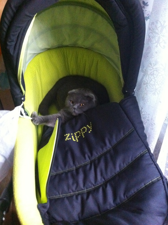 Хихихи)))) У нас тоже вислоушка любит коляску, люльку, коврик для ползания и сухой бассейн))) Она мне кажется искренне думает , что это все ей куплено и оскорбляется ,когда ее выгоняю))