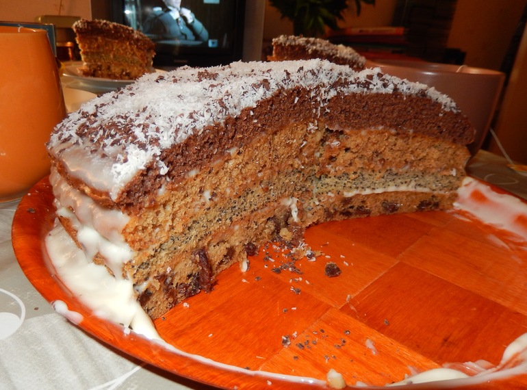 Поэтому вчера позвонила родителям и сказала, чтобы приезжали в гости с младшим братишкой на чаёк. Мама запретила что-либо готовить, сказала, чтобы я не суетилась, что купят сами тортик. Но я категорически против покупных тортов, так что попросила привезти мне только пару литров домашнего жирного молока, без которого жить не могу)) Они приехали с огромных букетом дачных пионов, литровым ведерком свежесорванной первой клубники, 2-х литровым ведерком свежесорванных черешен и 2-х литровым ведерком вкуснячего пломбира!!! Вот о каких подарках я и мечтала!!! Любимый муж стойчески выполнил все возложенные на него сегодня задачи: почистил и измельчил арахис для торта, почистил яйца и картошку на салатики, вынес мусор, помыл плиту, раковины и ванну. А я испекла тортик нехилого размера (боялась за результат, т.к. делала по этому рецепту впервые - и - ура! - получилось очень вкусно) и настругала пару салатов. А также все заценили домашние пельмени, которые мы вчера налепили с Андреем.