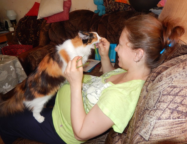 Наша Умка, уминающая травку, тортик и мой огромный пуз напоследок. Только что встала на весы... +17.200 от изначального добеременного веса... неужели такие цифры бывают? я вешу 87.200!!! Эх... Через час настанет лето... пойду поем клубничку)))