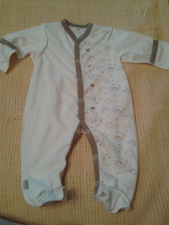 Этот комбинезончик заказывала на ярмарке мастеров. Т.к. фото на телефон, то оно не отображает нормальный цвет - экрю и маленькие золотистые бантики. Сам велюровый, х/б подкладка. НО мне кажется, что в середине июля в нем будет жарко...