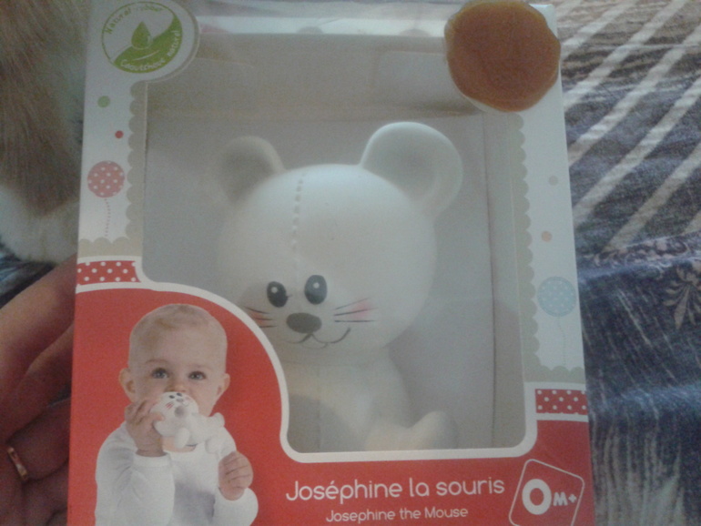 так же существуют медвежонок Габин, кот Лазар и Мышка Жозефи)) все они стоят 1199р. Мне жадно тратить столько на прорезыватель....НО...опять таки,на само самой нижней полке...стоят две коробки с мышкой Жозефи по уценке. мятые и чуть порванные коробки, не товарный вид))) по 499р. взяла обе. Одну нам, одну племяшке) (купила другую упаковку в цветочном рядом и переупаковала))теперь у нас есть вот такая красотка