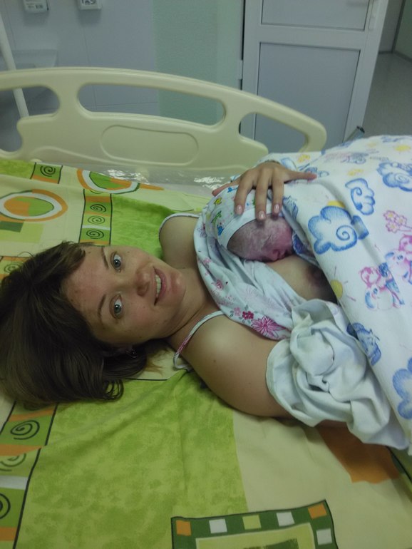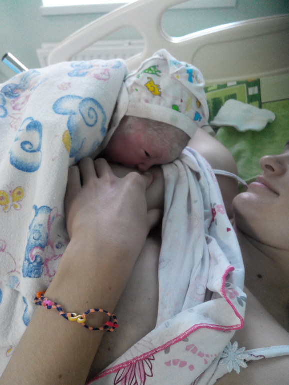 Начало тужить и акушерка ласково меня перетащила на кресло......повернули на бок.....разрешили потужиться..не сразу у меня получилось как надо...потому как схватка была непрерывной, а еще и потуга...а еще и дышать я старалась........хотя уже хотелось дышать как собачка и в голове мысли "капец..капец..капец....")))))))))) но считал Макс..и я старалась дышать на его счет.....В карточке написано, что потужной период у меня был 15 минут))))))) реально в несколько уже правильных потуг родилась Машенька)))) головка прошла хорошо.....плечики я в этот раз рожала больнее всего.....и все...последняя потуга.....прыгающий от счастья Макс, повторяющий "Маша...Маша родилась" и теплый кричащий комочек на животе)))))) сразу укрыли ее на мне )))))))) Итого в 09.45 родилась моя вторая доченька Машенька))))
