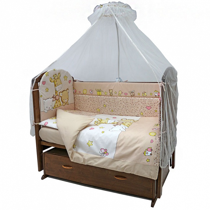 Там же мы приобрели комплект постельного белья в кроватку и держатель для балдахина... Комплек "Детский мир" 7 предметов бежевый...Выбрали тоже не самый дорогой и не самый дешёвый...Расцветка,как мне кажется девчачья немного,но муж настаивал на своём, надеюсь нашему мальчику понравятся зверюшки))