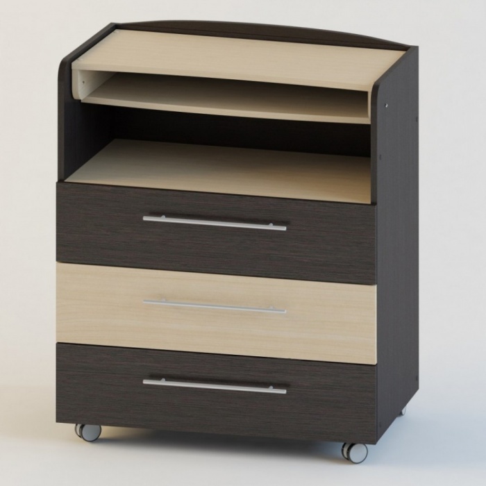Третье, комод с пеленальным столиком. Выбрали Кристалл-4 венге/клён...Основным требованием было отсутствие четвертого ящика,т.к. считаю,что в него не удобно залазить,при разложенном пеленальном столике...