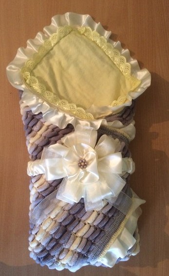 Верхний слой - помпонная пряжа, нижний - фланель. По краям бейка+кружево+атласная лента. Бант и пояс - атласная лента+резинка. Крепится на кнопки :)