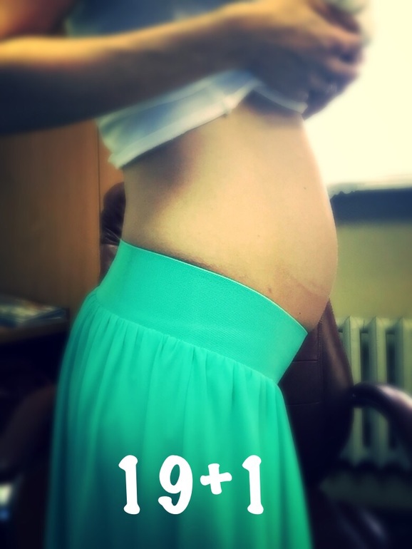 У нас сегодня 19+1. Животик заметный, так как сама по себе очень худая. На работе все сразу все поняли (до этого была в отпуске, поэтому не знали). Но это вторая беременность, в первую на таком сроке почти незаметно было