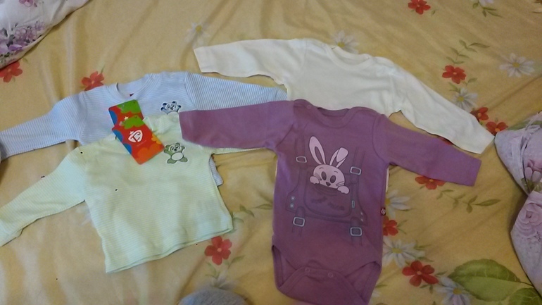 Еще прикупила две кофточки побольше (62 и 68) и два боди с длинными рукавами (56 и 62 р). В шмотке по акции на 350 руб все 4 вещи ))
