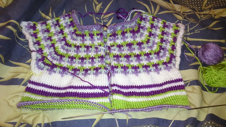 А рукава будут по плану?) Если да - я бы сделала их однотонными, фиолетовыми. Это добавит сдержанности, более "мальчишских" красок. При этом кофточка останется яркой и интересной))