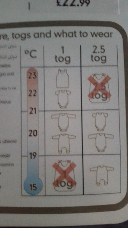Постельные принадлежностиДевочки купила для малышки спальный мешок. Не пойму что за таблица? Вроде как обозначено что и при какой температуре поддевать! Но не понятно что за 1 tog и 2.5 tog! Объясните пжл!!!