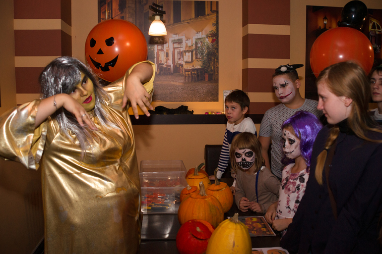 В субботу был превосходный праздник для девочки 13 лет, праздновали день рожденье в стиле hallowen. Праздники я конечно уже не веду, 28 недель всё-таки :))) но есть клиенты, которых ведешь уже много лет и они ну, очень просят просто поприсутствовать на празднике, т.к. детки меня любят (не один праздник уже вместе отпрыгали) и провести мастер-класс. В этот раз вырезали тыквы и еще много чего интересного делали :)