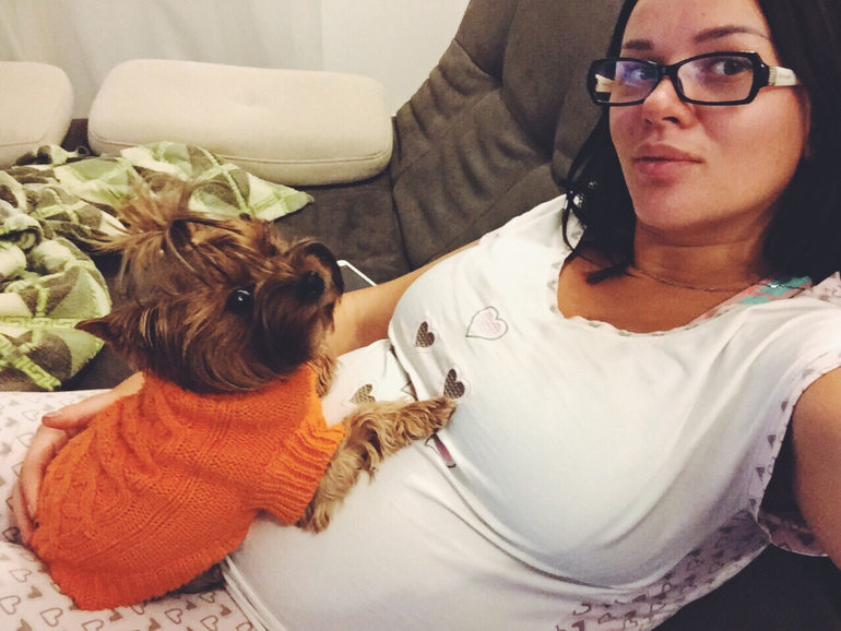 Фото пузиковВот и мы)))) знакомьтесь с нашей старшенькой! Я балдею как они общаются с малышом. Как только Виня "собака" ложится на живот, сынуля начинает её пинать, а она тычет носом в живот)))