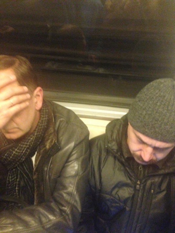 вот еду в Московском метро, фиолетовая ветка... Передо мной сидят пять мужиков ))) никто место не уступает. Живот уже приличный и так его показала и подержала(эксперимент ) ноль реакции. Вот так сидят .., см фото