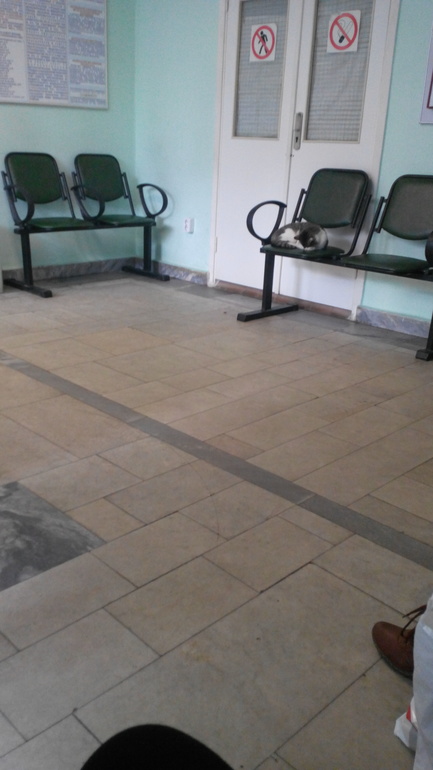 В 13:45 приехала в 11 роддом на плановую госпитализацию. Но мы же в России, тут не все так просто)))) Приемное отделение для рожениц - маленькая комнатушка, стулья, спящая кошка. Очередь. Девушки смеются, что проще по скорой попасть, чем отсюда. Передо мной трое. Сидим, ждем))