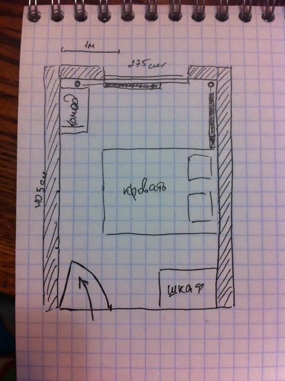 Имеется кровать двухспальная (140х200см), платяной шкаф (100х60 см), комод (80х60 см), и будет кроватка детская (около 130 см в длину и 60 см в ширину). План прикладываю. У кого какие идеи, куда и как что поставить, чтобы и нам было удобно, и шкаф открывался, и батарея никого не зажарила в ночи?