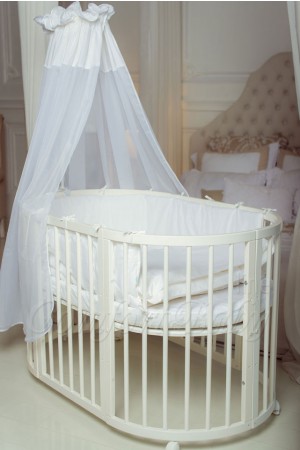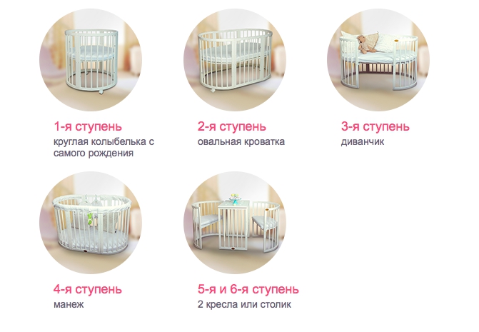 У кровати несколько трансформаций - сначала маленькая круглая люлька, которая занимает мало места и крайне симпатичная, потом кровать увеличивается, после того, как ребенок вырос можно использовать как столик и 2 кресла. Есть еще одна трансформация с длинной кроватки до заявленных 9 лет, мы ее не брали, тк рассчитываем больше чем на одного ребенка и кровать будет переходить по наследству. Маятник так же можно взять допом, мы не стали. Еще плюс кроватки, что она на колесиках со стопорами, можно передвигать по комнате очень легко.