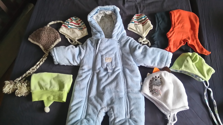 Но, если я иду в супермаркет, то в магазине ребенку будет в таком жарко. Тогда я одеваю комбинезончик без утеплителя (выглядят как стеганые одеяла) - просто много слоев хлопка, идти до магазина мне 5 минут и я прикрываю ребенка пледиком. На фото крайний справа и нижний крайний слева (это 68 и 62 размер, а суть одна и та же). Так же пододеваю обычную х/б шапочку.