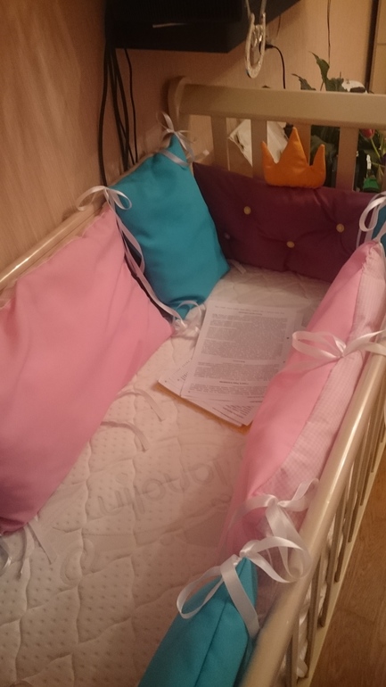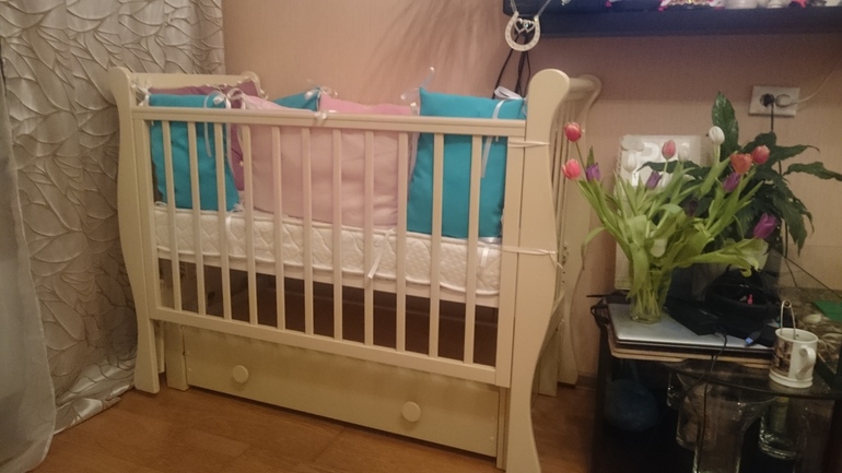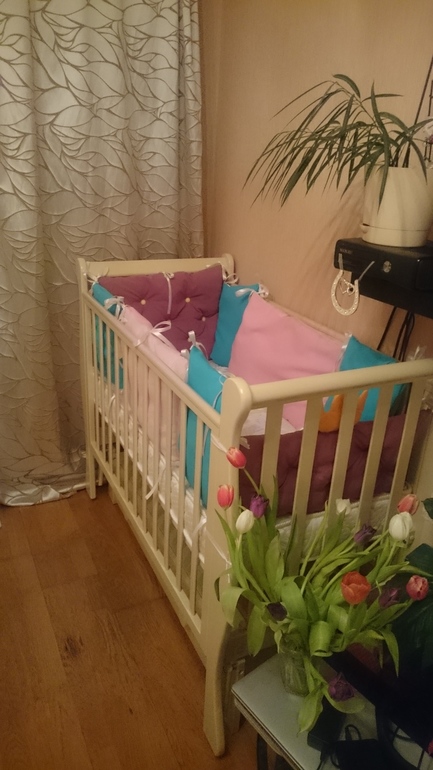 Кроватка у нас с продольным маятником, кубаньлесстрой слоновая кость, бортики я сшила сама) так же сейчас сошью сама дополнительный комплект белья) уеду в роддом муж сделает перестановку в комнате так что над кроваткой телевизора и полки не будет)