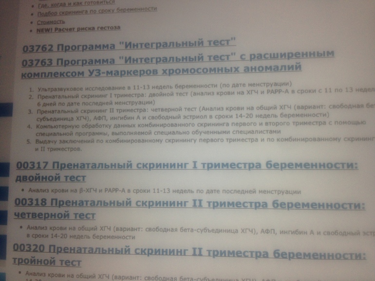я делала в Цире. Сначала звоните по горячей линии и записываетесь на скрининг на определенную дату по мес. Лучше чтобы было больше 12 недель, но и не больше 12+6. Делаете сначала узи. Там программа расчитывает все риски. После этого идете сдавать кровь, т.к. там нужно будет заполнять анкету по р-там узи. В этот же день приходит ответ на почту.