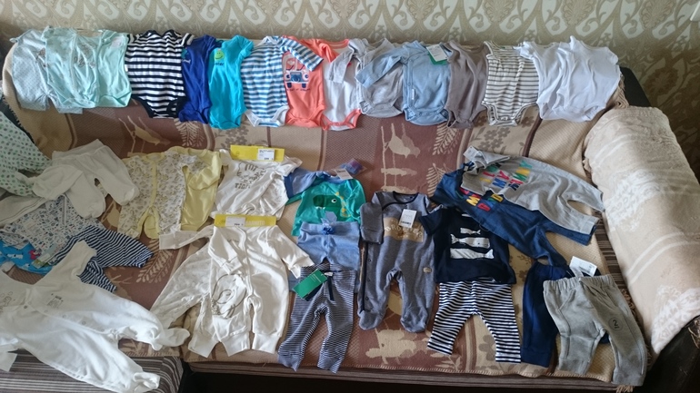 Ого,зпчем столько вещей...может они хоть на вырост?? По факту столько не наддо,зря потрачены деньги,пока не по стирали,не срезайти этикетки и по пробуйте продать,половину так точно,бодиков особенно.