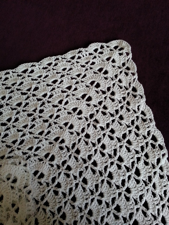 Вязала с учетом, что сынок родится осенью- детская пряжа шерсть+акрил, полотно и ажурное, и тепленькое, и очень мягкое. Размер, правда, как-то неожиданно оказался больше ожидаемого- 135*135 вместо 100*100, но это вряд ли недостаток ))
