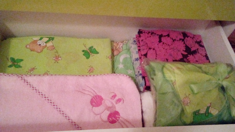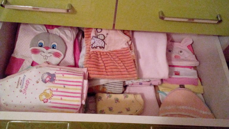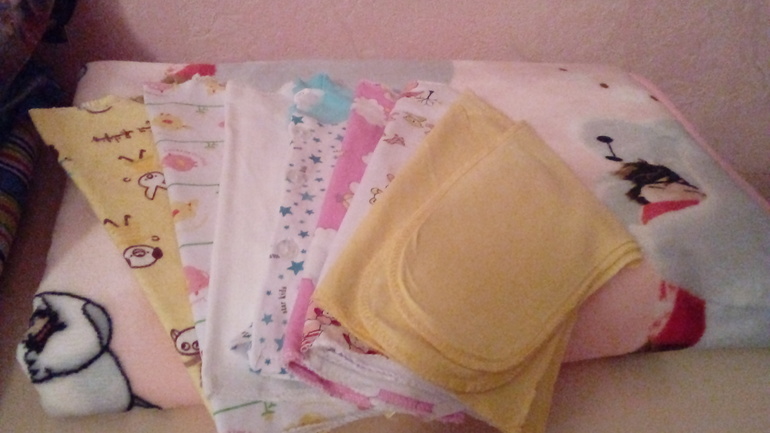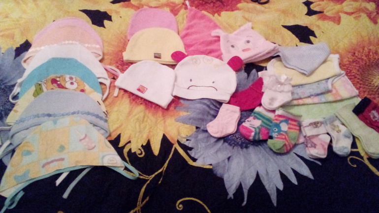 Ну и вещички на первое время насчитала 12 носочков и 3 пинеток.Салфетки и 4 слюнявчика.10 пеленок байковых 5 фланель и коконы 4 шт.Кофточки с ручками 15 шт.На кнопочках и пуговичках всякие 12 шт. И теплые 3 кофты.Ползуны 16шт.штанишки одни всего и колготки 2 шт.бодики 7 шт.слипы 13 шт. Шапочки 9 шт.и чепчики 12 шт.2 спальника.