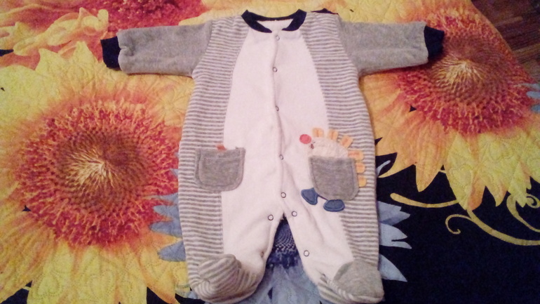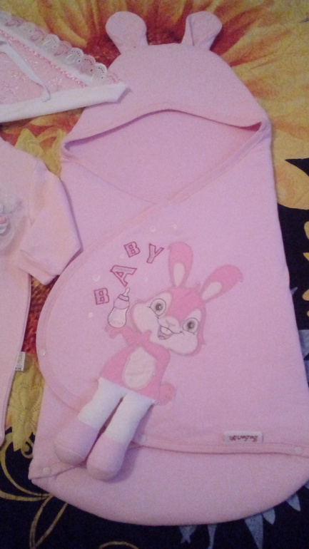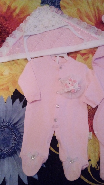 И после этих схваток приготовила все на выписку и на посещение халаты одноразовые,маски и бахилы.И вот это наши наряды на выписку это доче: