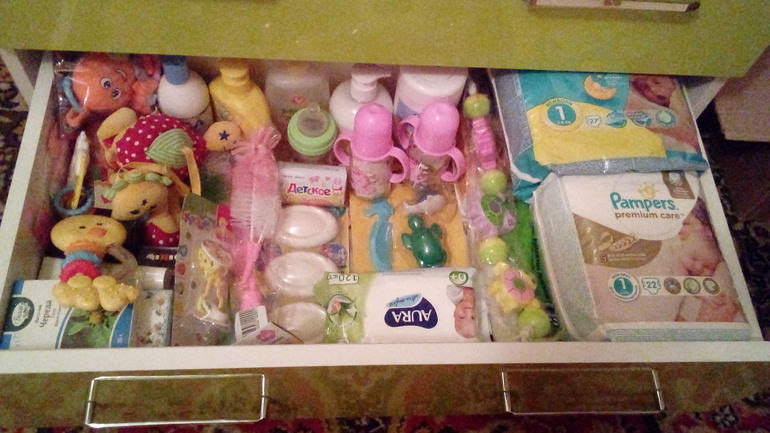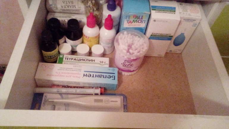 Ну теперь пробежимся по комоду и так аптечка тут часть так как многое с собой беру в роддом.Ну основное это эл.гралусник,травы,бепантены,тетрациклин глазная,хлор филипт,газоотводная трубочка,аспиратор назальный,бинты,вата,крема всякие,присыпка,зеленка,йод,эспумизан и бебинос и т.д.