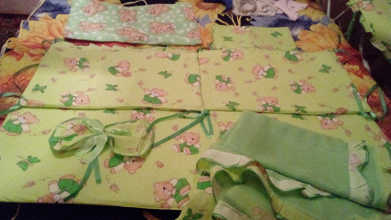Ну и вот мы готовы полностью.Вещички дома только до 2 мес.остальное у мамы все по месяцам до года лежит уже тоже перестирано и переглажено.И так что мы имеем пробежимся)))И так поехали крупногабарит наш:кроватка у мамы еще матрасик ортопед тоже там и вот к ней бортики,балдахин и постельное