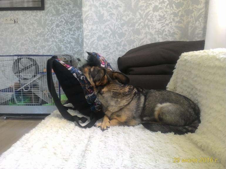 собака грустит....племянник вышел в магаз, она вся в печали лежит на его вещах))))