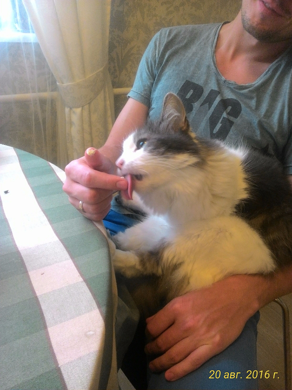 Тот самый момент, когда кот истечет слюной, но на стол ни-ни))) в награду дали лизнуть сырочка плавленного) Кстати сырок, тоже для беззубого мужа)))