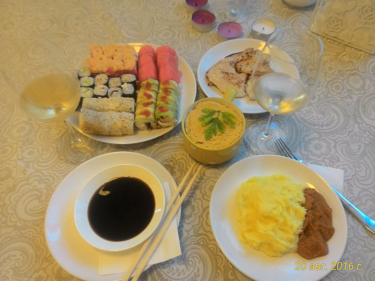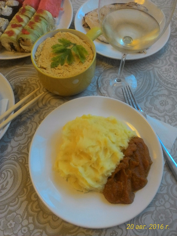 Наша 11 годовщина свадьбы!))) праздничная еда моего беззубого мачо - пюре, паштет, икра)))) говорит плохо, ест еще хуже))) вино с моего ДР, никак не допьем, уже и мужа сестры угощали...а оно все есть)))
