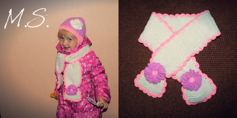 Я всё занимаюсь своим любимым делом и вяжу для своих дочурок.Вот на днях Варюше связала очередной комплектик(шапку и шарфик)