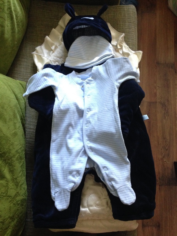 На доче был слип, шапочка, носочки и конверт керри. Для меня принципиально было наличие прорезей под автокресло.