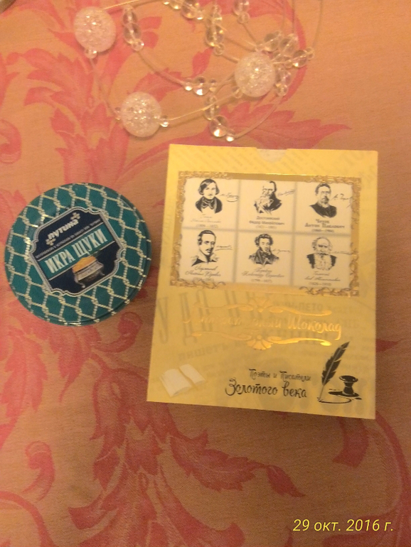 В пятницу приехал муж из командировки, из Питера, привез нам "Литературный шоколад" и икру Путина))))) Ржот- говорит, ненуачо, у тебя же норм все с сахаром, и отеки не от соли))))))