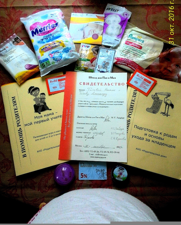 А на самом деле все очень понравилось! Вели курсы шикарные психолог, акушерка, и педиатр! Прям все по мне! По моим взглядам) Все мифы развенчаны, страхи и сомнения развены!)))) Муж вобще очень доволен!) и практики было нормально, и группа хорошая была, все уютно, комфортно) Вот сбственно докУмент, и подарочки)