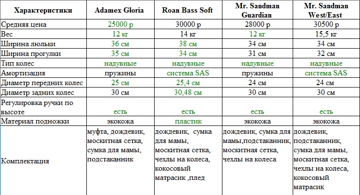 Коляски практически одинаковые. Сделала сравнительную таблицу по интересующим меня характеристикам: