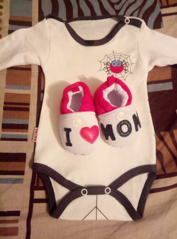 спинка с большим паучком, а перед с маленьким) А сверху это наши тапули- I love mom . Они по качеству вообще обалденные) утепленные, но внутри без всякой овчины, внутри резиночка, тянуться оп объему ножки)