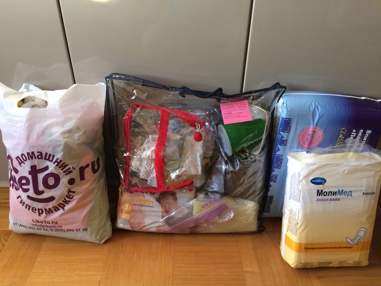 (тут у меня один обычный пакет, одна прозрачная сумка из-под одеяла, но пачка прокладок и пачка пелёнок никуда не влезают, поэтому отдельно)