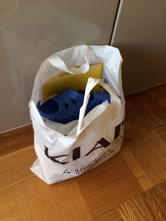 Если еду куда-то гулять, беру с собой доки, зарядку, шлёпки и чулки, остальное не так критично, да и можно по дороге купить. Муж тоже вовсю ездит с доками и шлёпками.
