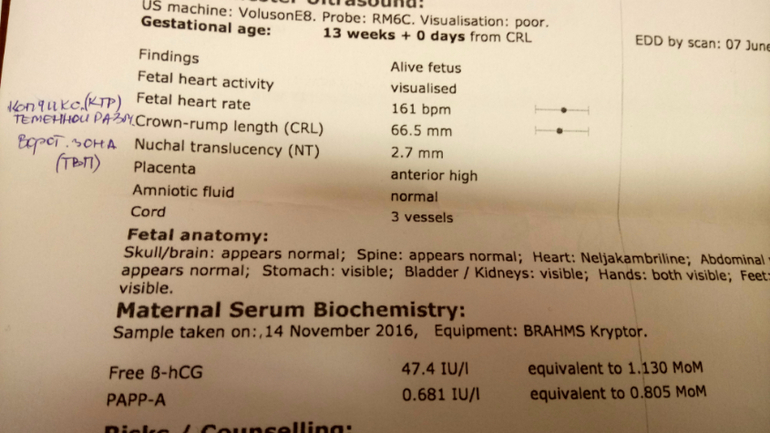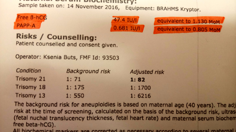 После того, как мне поставили риск, я стала изучать материалы в нете и здесь посты читала. Стала сопоставлять анализы, скриниги своей прервавшейся беременности в июне прошлого года. Тогда у меня вообще никаких рисков не было, ниже будут фото первого скринига неудавшейся беременности . Так вот , после ИР на 20 неделе делали исследование плода. Не генетическое. Я возьми и залезь почитать анамнез. Дело в том, что врач мне говорила, что ребеночек был здоров и пуповина просто на узел завязалась, да, это причина смерти ребенка, но я обалдела, когда распечатала себе этот анамнез и стала читать его. Это Слава БОгу, что у меня есть возможность по работе, залезть в свою электронную историю болезни. Фак!