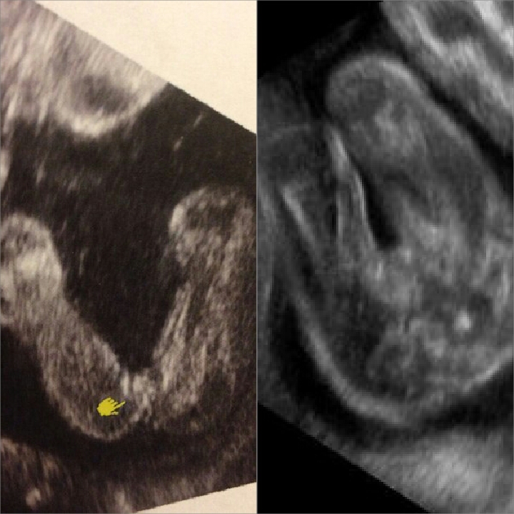 Да я уж поняла. Но не очевидно. То ли ракурс совсем неудачный. У мальчиков обычно на таком сроке прям торчит