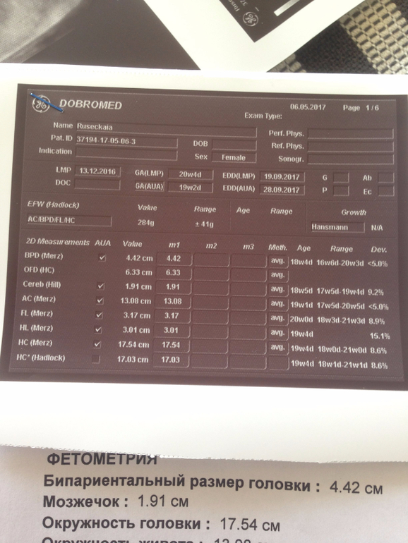 Ну и фото наших показателей. Поставили нам на неделю меньше, чем по месячным, но вроде не сказали, что это плохо... Я вообще думаю, что малышка в меня, я родилась очень маленькой. Посмотрим, что моя Г скажет, к ней правда теперь только через 12 дней.